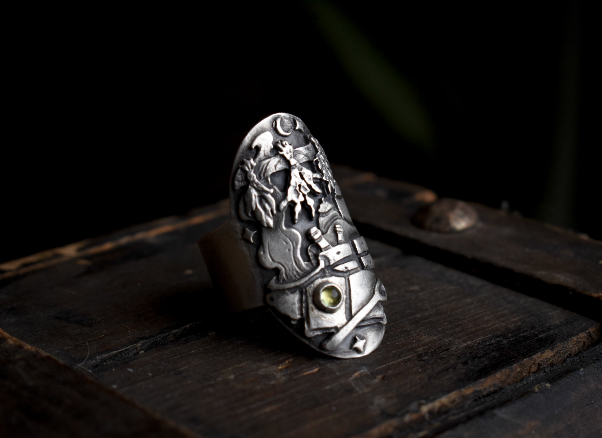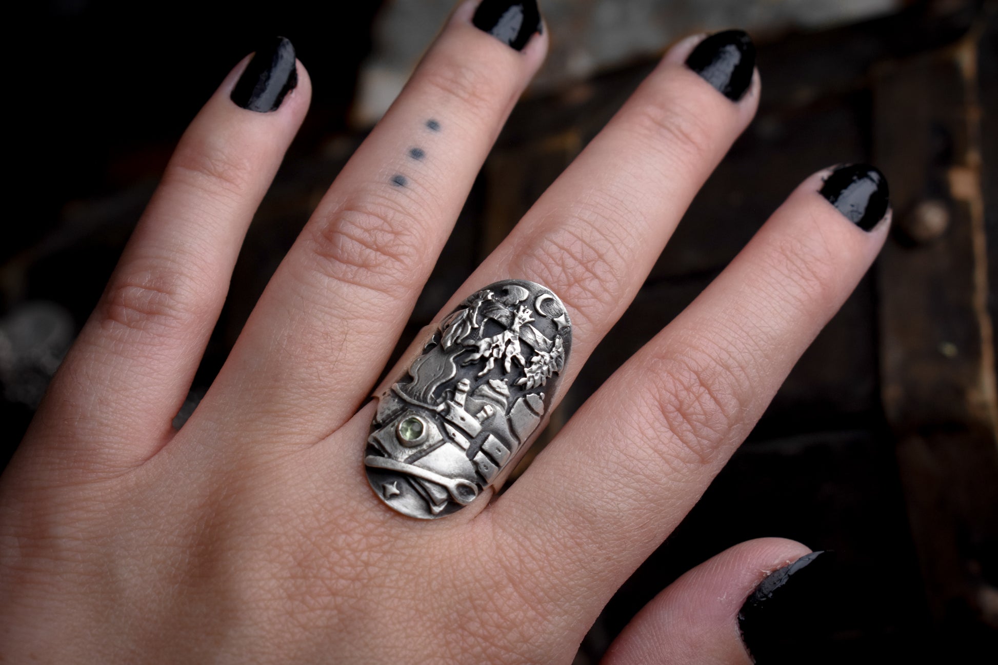 Hand-forged in sterling silver, this ring conjures the cozy, spellbound atmosphere of a witch’s kitchen. Tiny details tell a story: dried herbs hang above a bubbling cauldron, while a rustic wooden cabinet with little drawers holds jars of mysterious ingredients. An open spellbook rests nearby, its pages alive with secrets with a peridot gemstone sparkling over its pages, alongside a ladle ready to stir whatever enchantment is brewing. Each element comes together to capture the magic of hearth, home, an intimate glimpse into the alchemy of everyday magic.