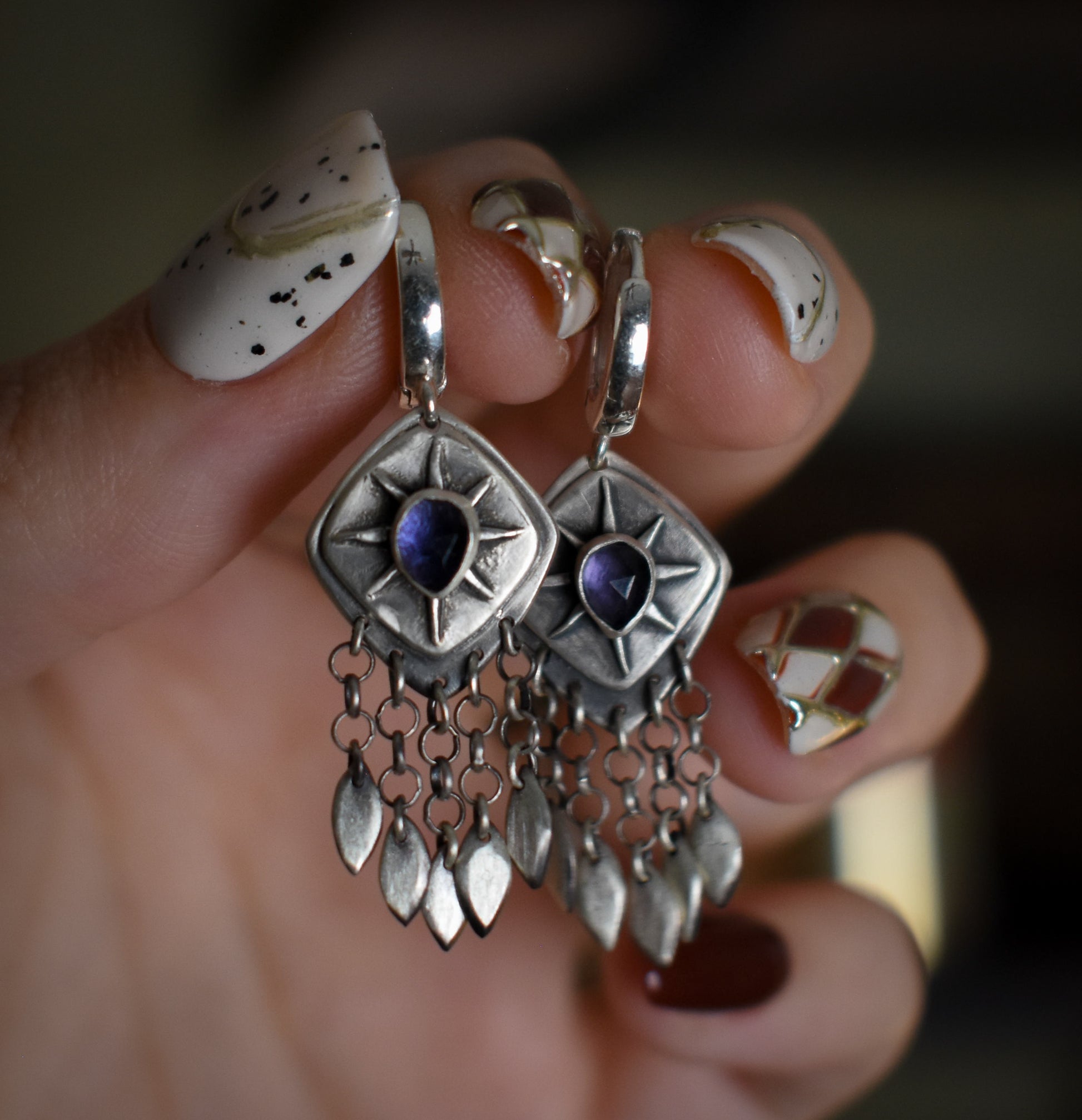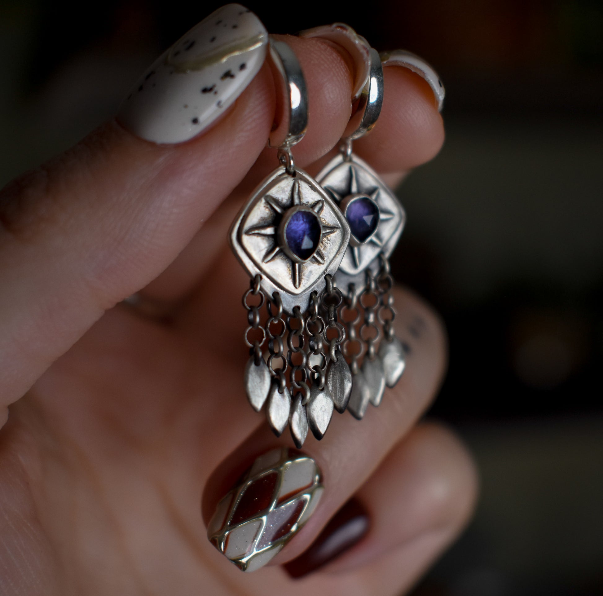 Hand-crafted from sterling silver, these earrings feature a radiant star topped with teardrop-shaped iolite gemstones.