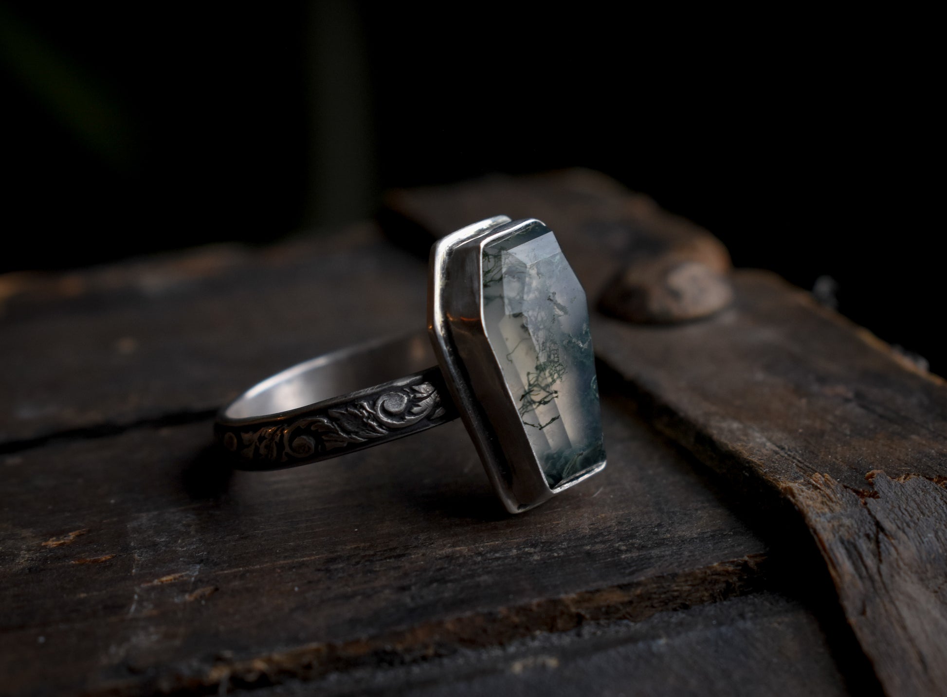 Hand-forged in sterling silver, this one-of-a-kind ring features a coffin-cut moss agate cabochon, its green tendrils suspended like ancient forest shadows within stone. Set on a band detailed with subtle leafy engravings, this piece carries both the mystery of the grave and the quiet renewal of nature.