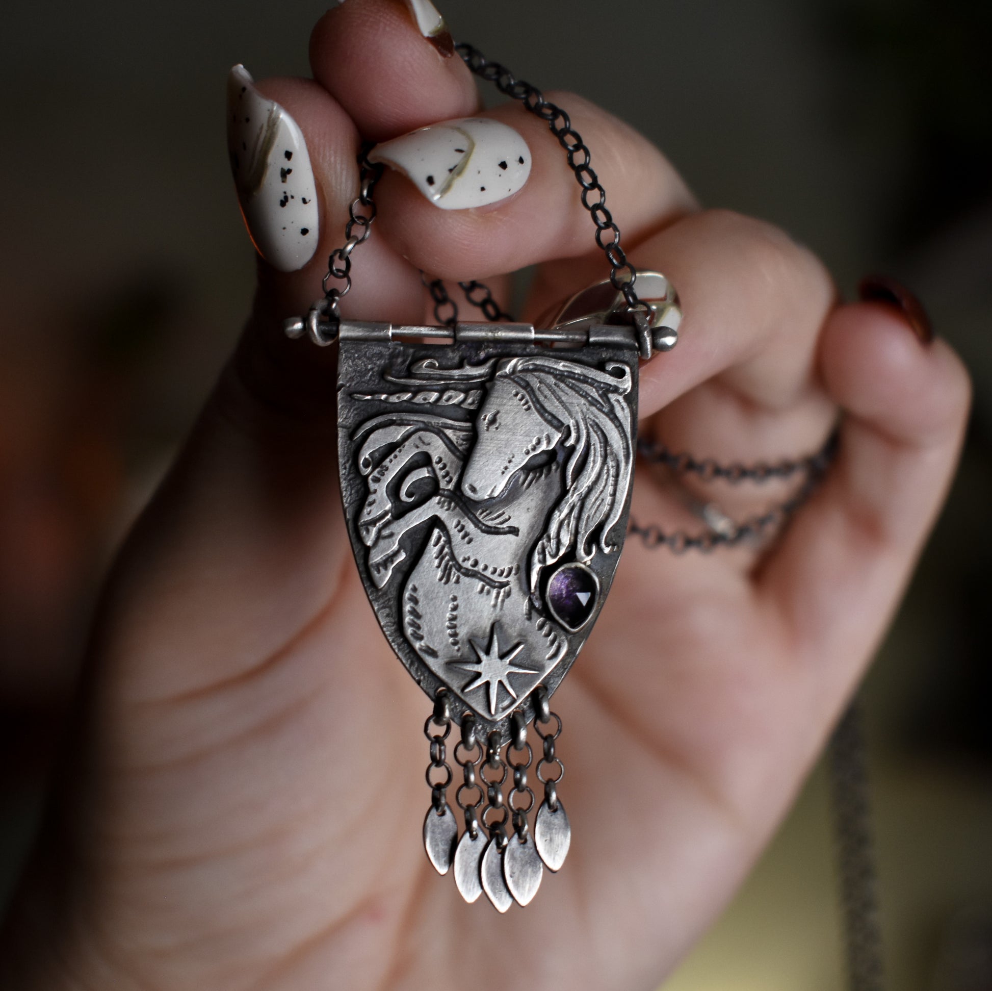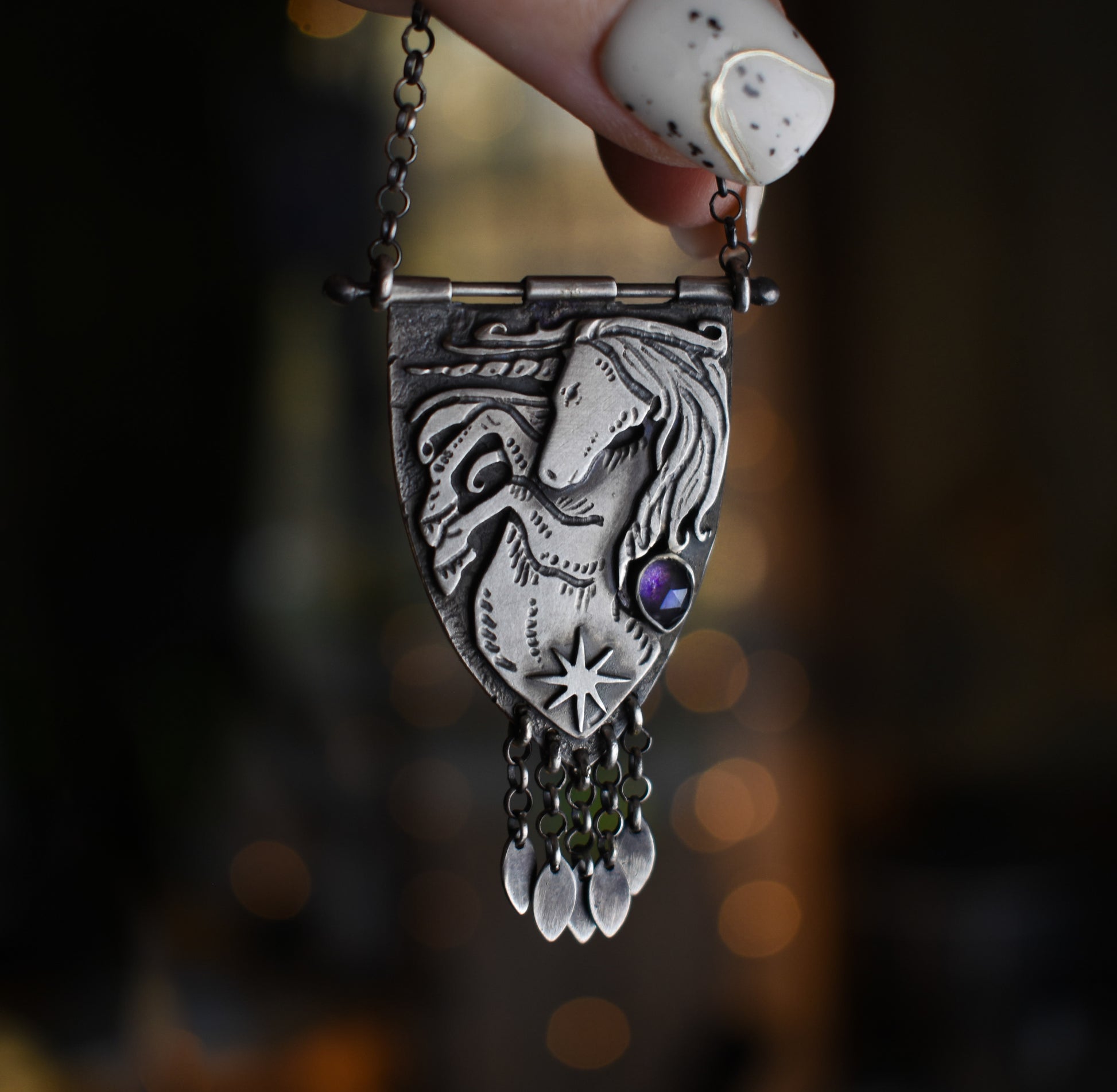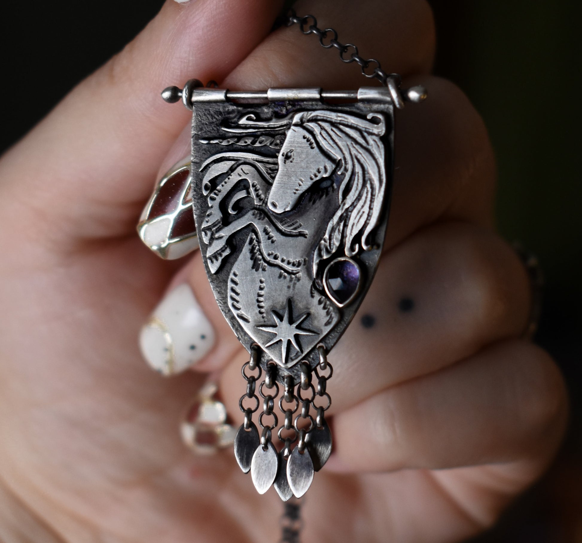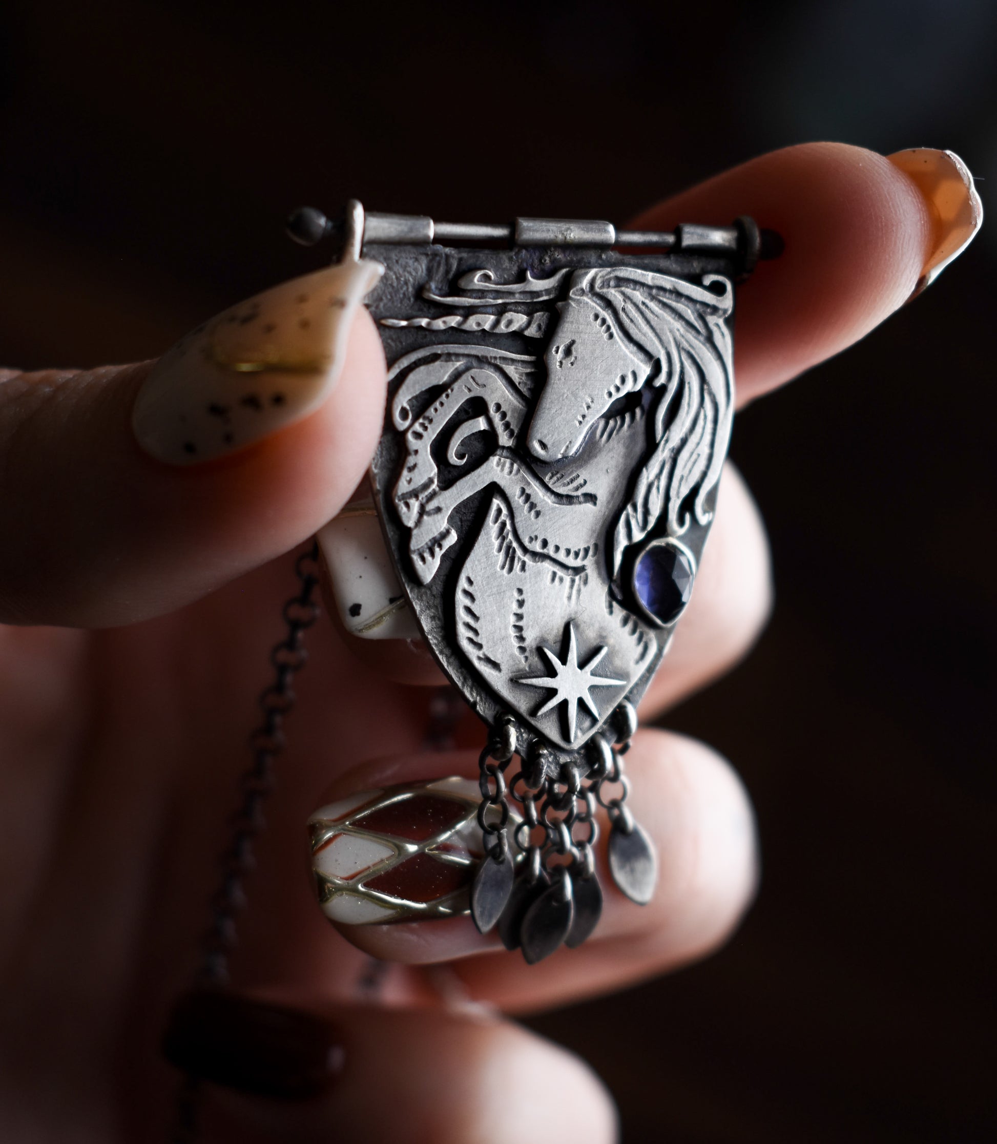 This sterling silver unicorn, Scotland’s national animal, is designed in a medieval banner style. It features small chainmail & scalemail pieces that hang neatly from the bottom for a unique fantasy touch. It’s finished with an iolite gemstone, whose bluish-purple colour shifts subtly depending on the angle and the light.