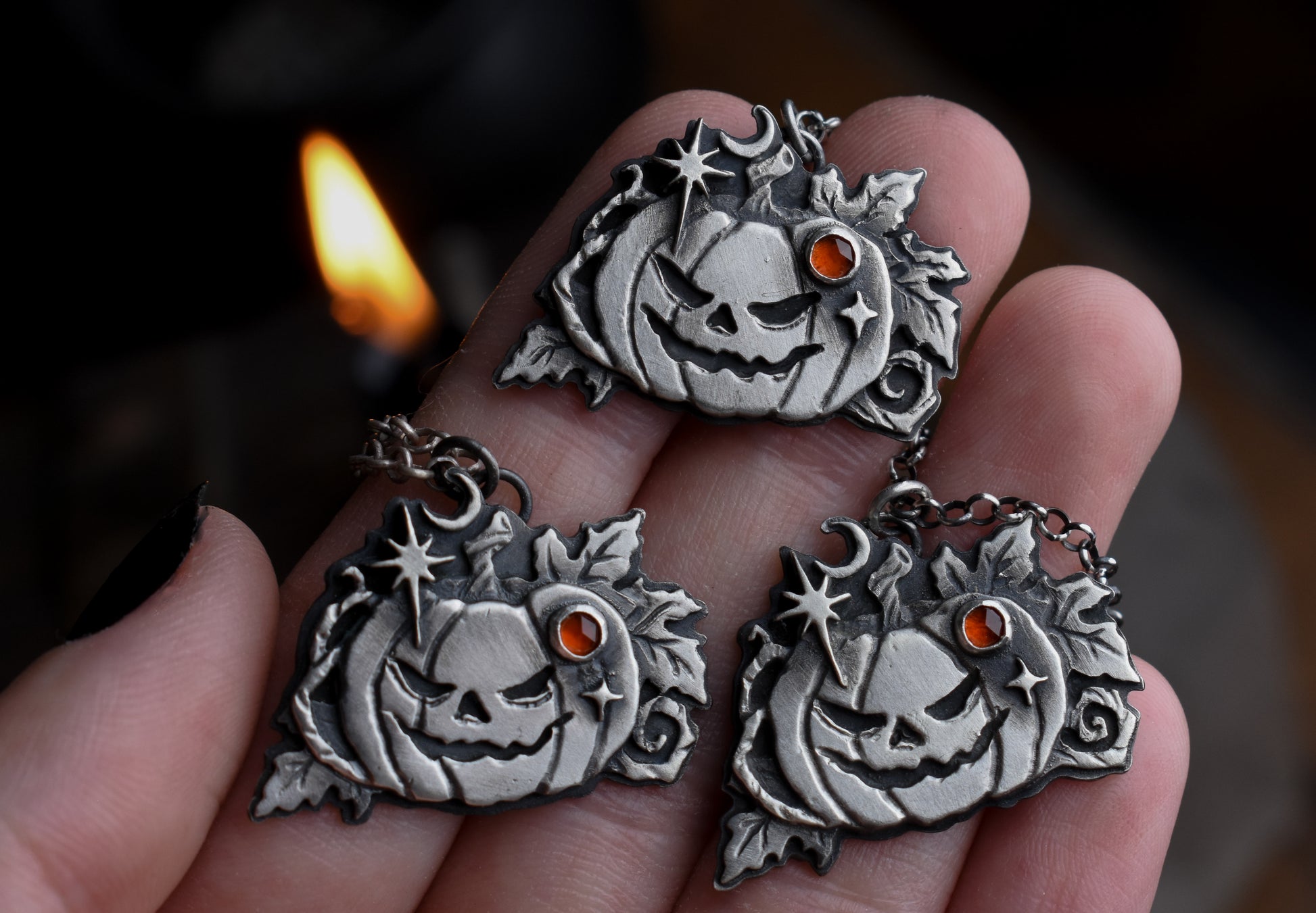 Carved from sterling silver, these pendants capture the spirit of Halloween itself. Each one features a wickedly grinning pumpkin framed with curling vines, a crescent moon and starlight, finished with a fiery orange Spessartine gemstone.